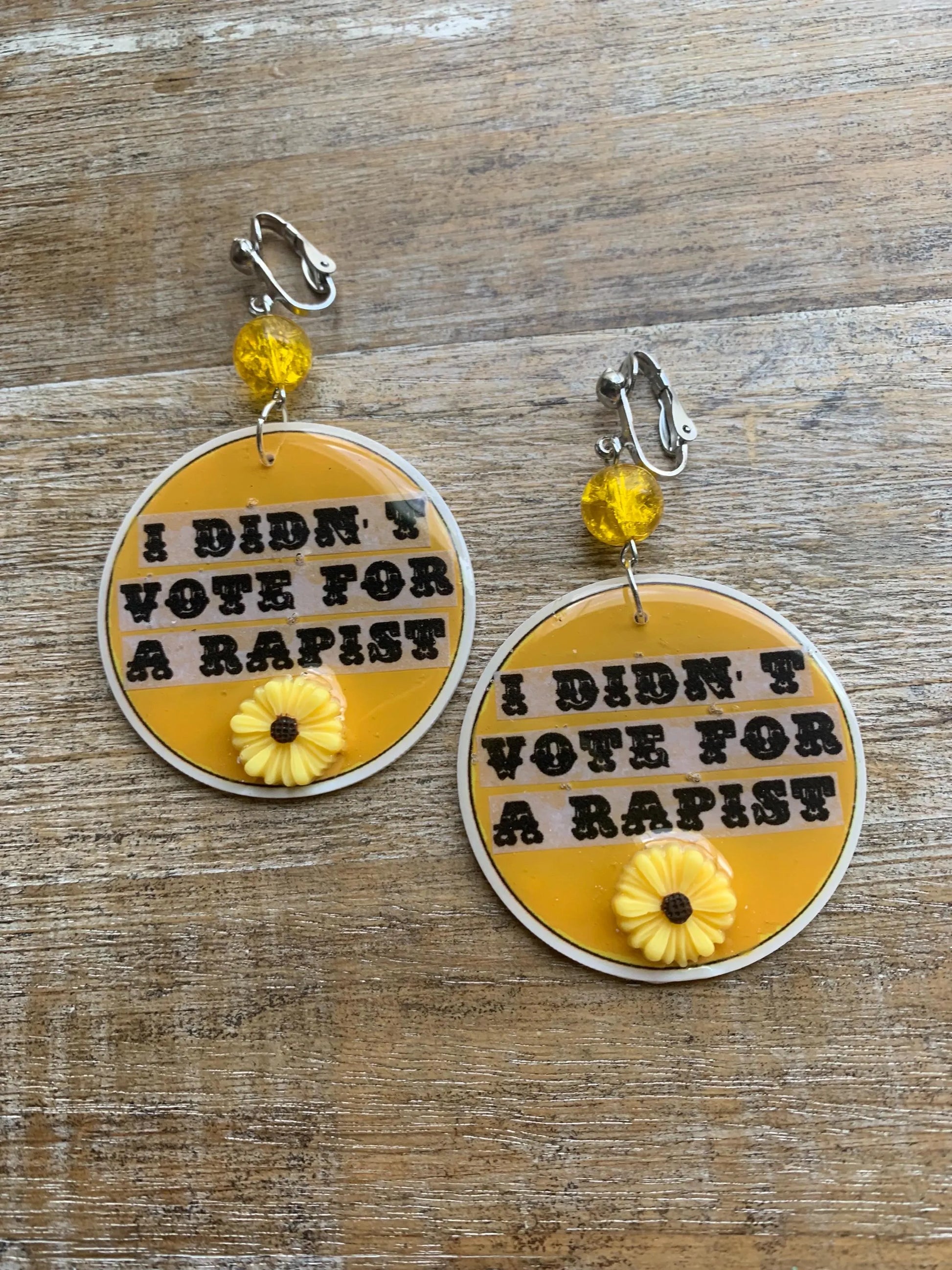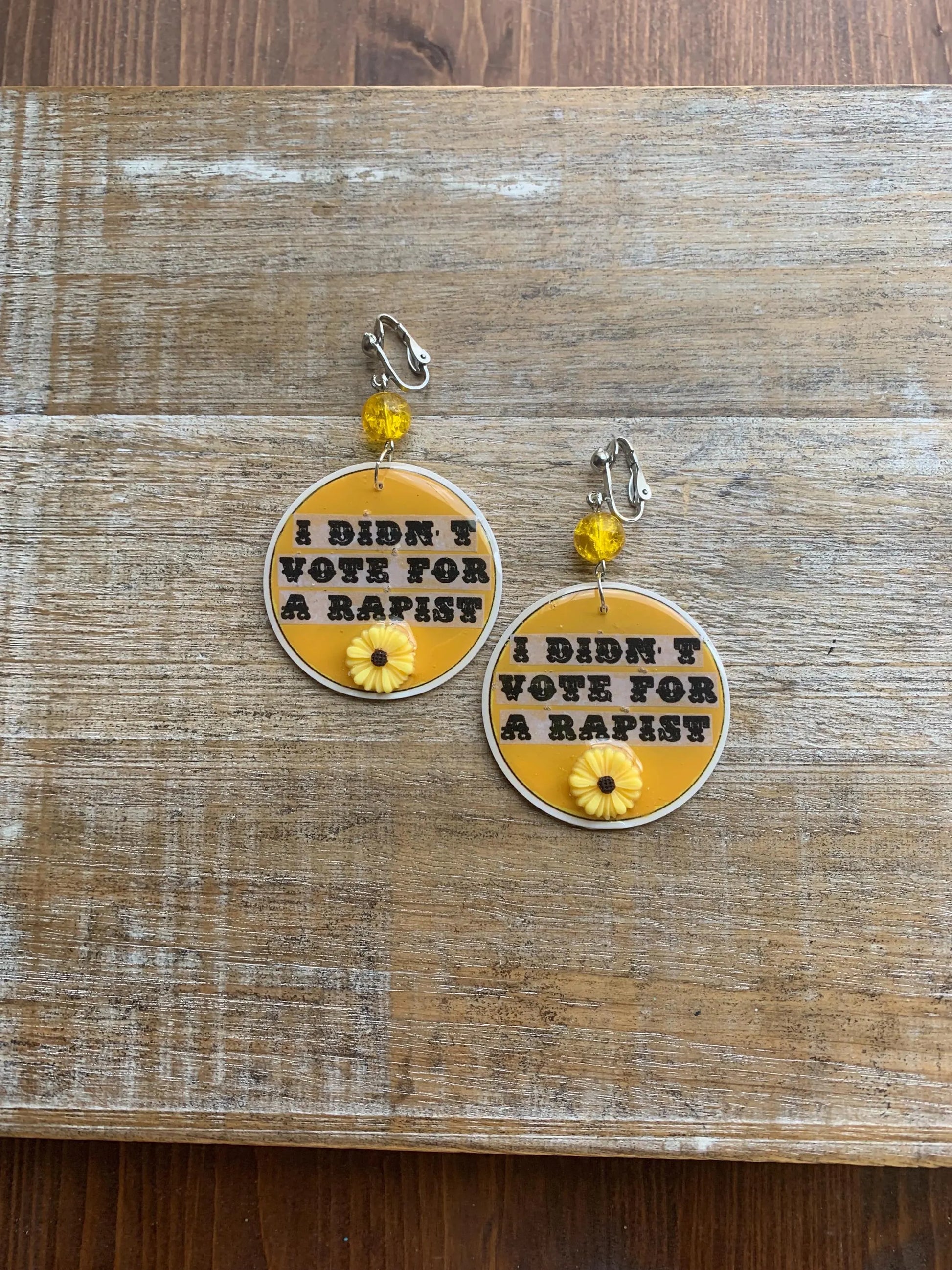 Anti Trump Clip On Earrings Art Deco Democrat Trump for Prison I Didn't Vote for a Rapist Yellow Sunflower Activist Statement
