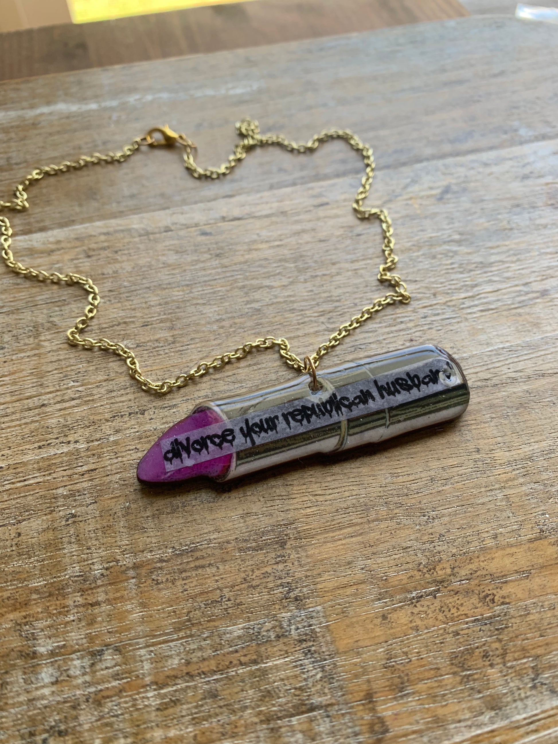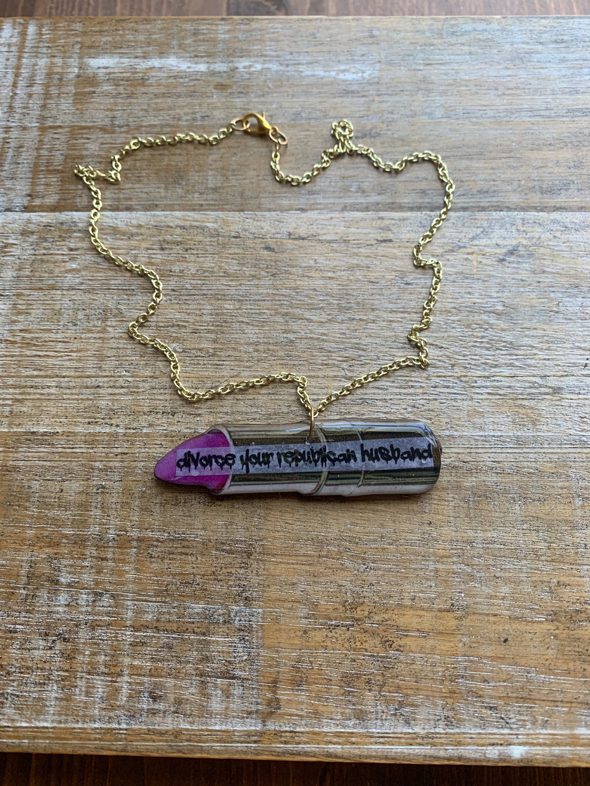 As-Is Divorce Your Republican Husband Pink Lipstick Gold Tone Necklace
