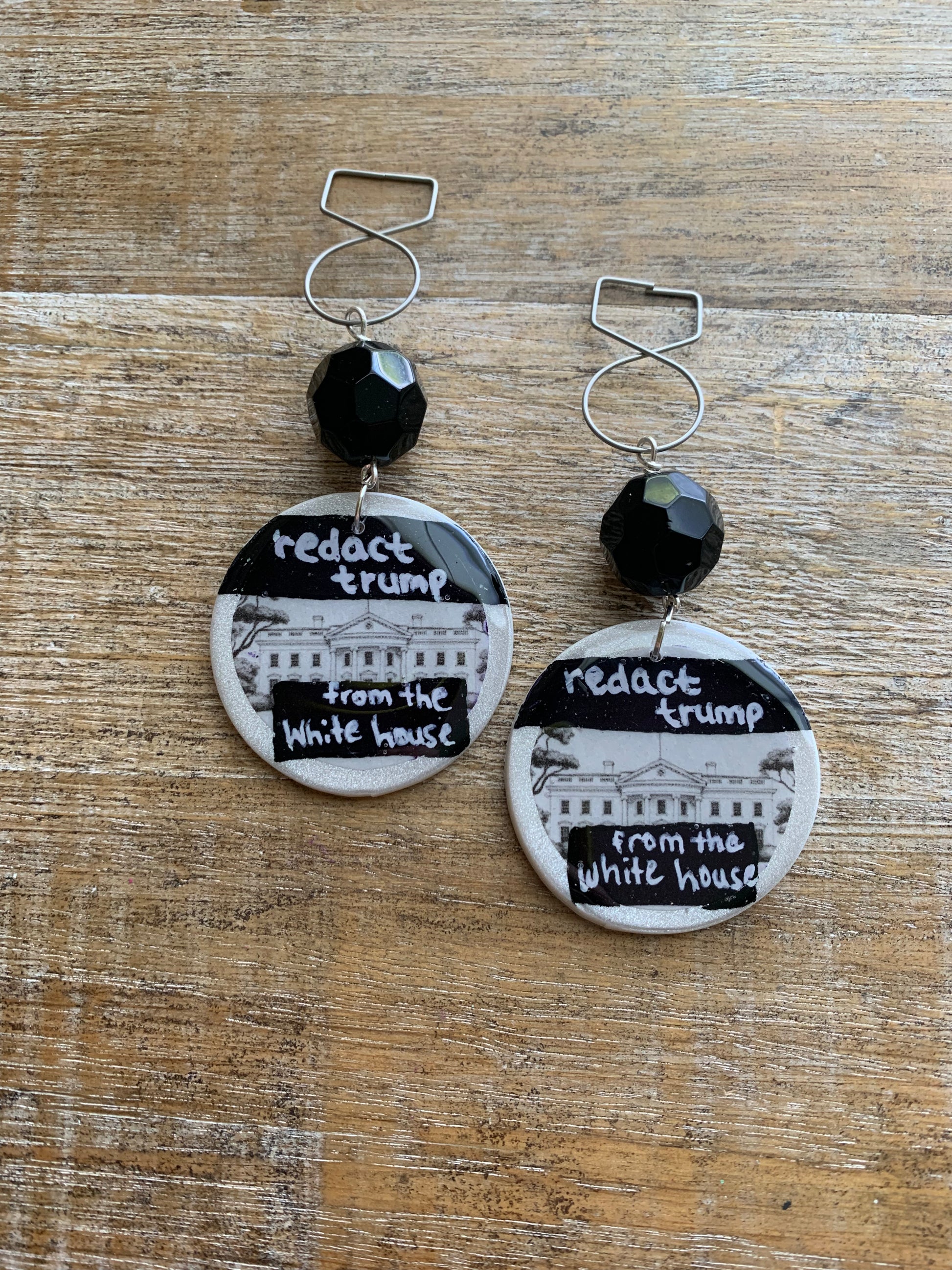 Redact Trump from the White House Anti Trump Tunnel Gauge Earrings Art Deco White Black Liberal Clip On Earrings
