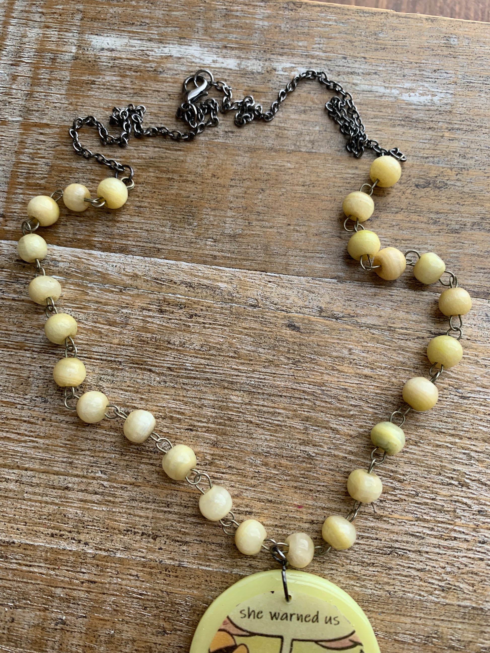 Handmade with polymer clay, resin, paper and glass beads strand from a broken necklace. The wire used with the beads are a matte silver color, and because this was upcyled wear is visible. The added chain is a dark gunmetal color. This is one of a kind!