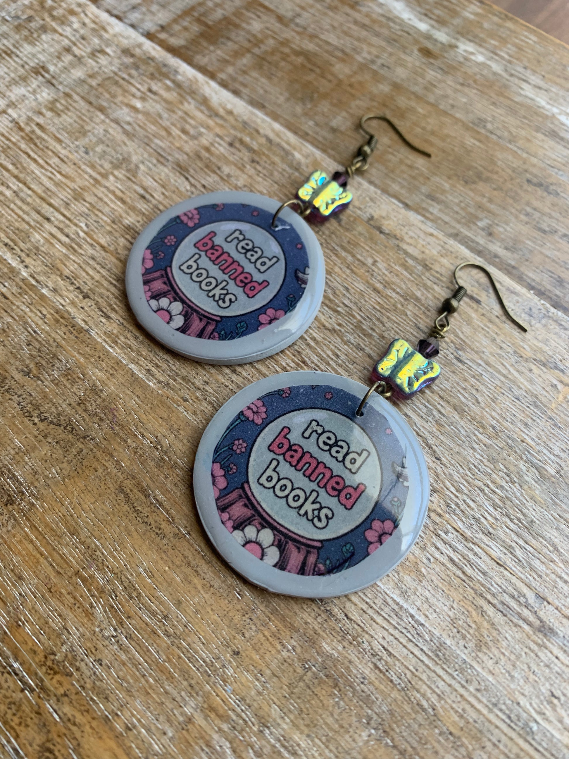 read banned books earrings. made with clay, paper, glass and sealed with resin for a glossy shine. some small bubbles exist. These are one of a kind!