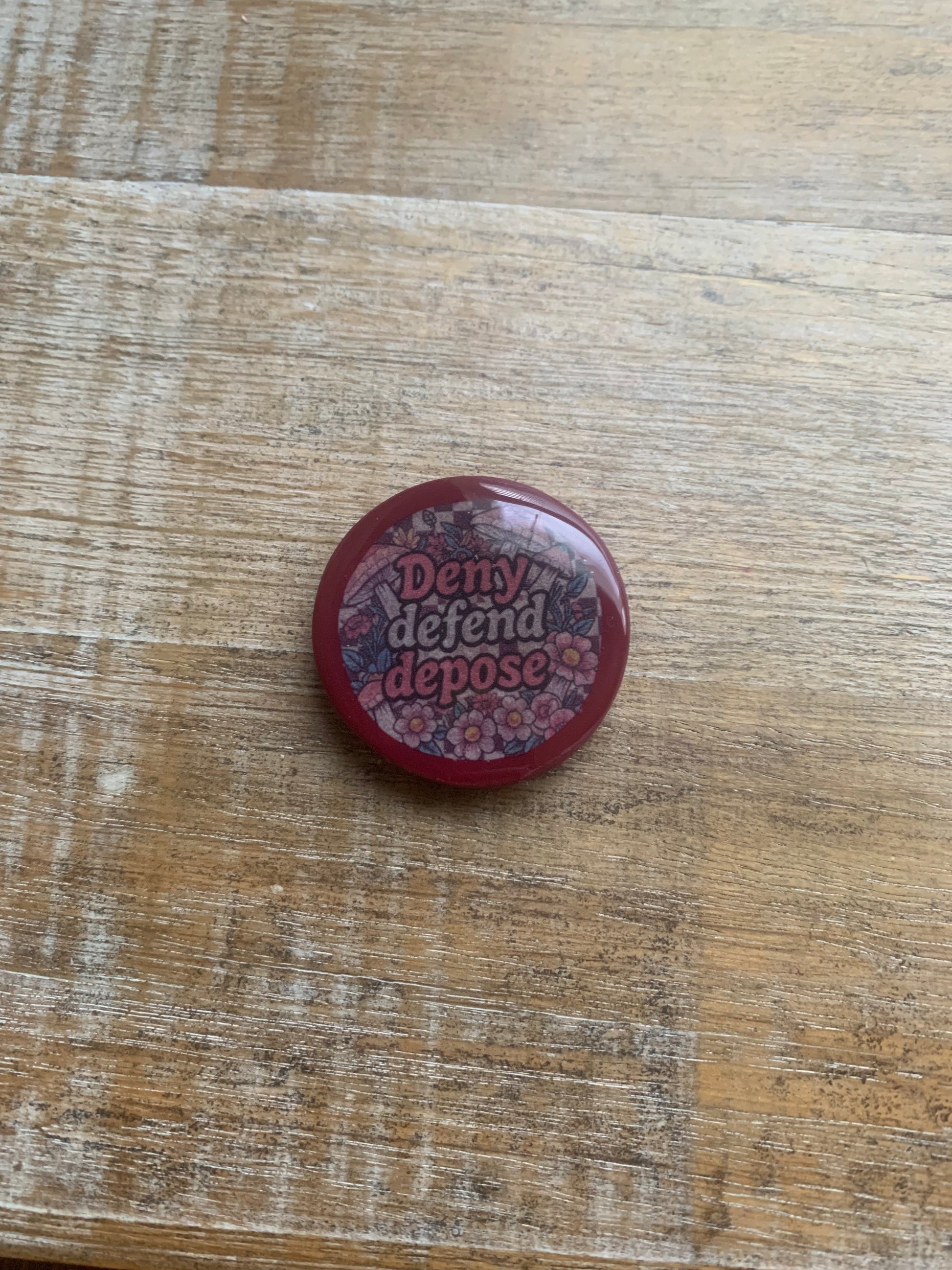 Deny Defend Depose Burgundy Floral Mushroom Polymer Clay Fridge Magnet
