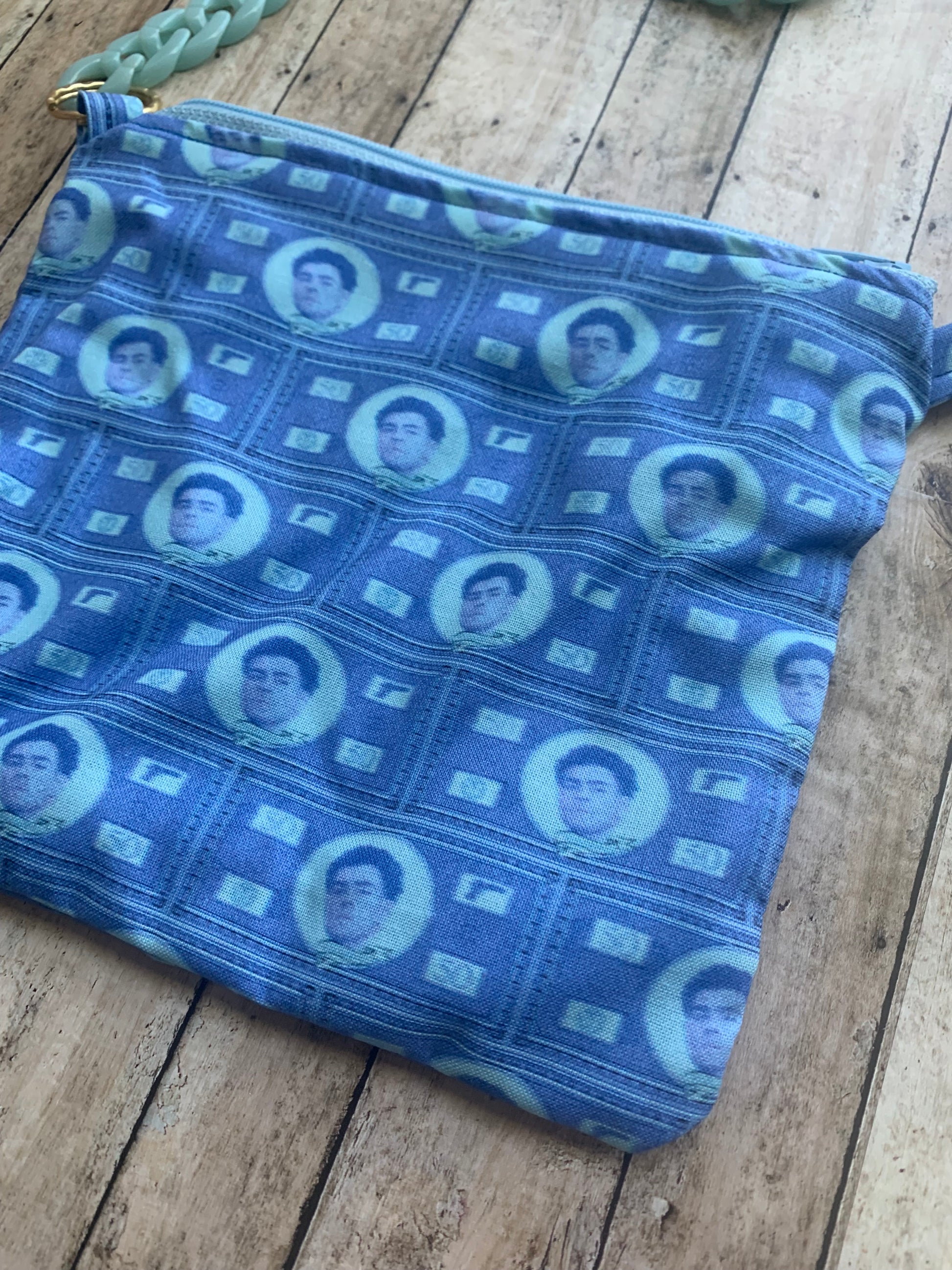 Made with cotton Spoonflower fabric designed by me. hand wash, air dry. Strap is not adjustable (unless you take some of the plastic rings off). This purse has only one main section inside. Does not include the dollar or the lipstick.
