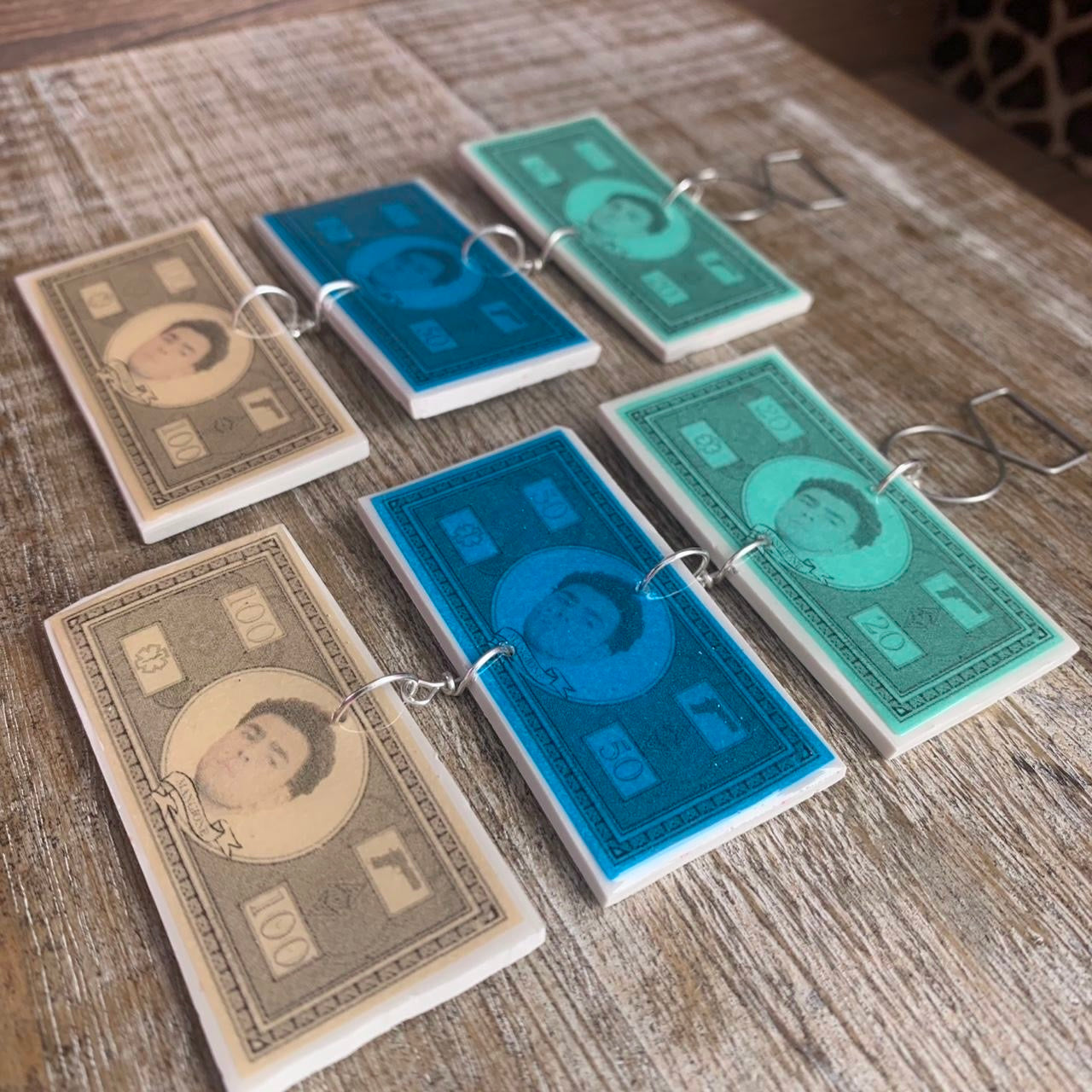 Made with polymer clay. Sealed with resin for a glossy shine! Some small bubbles do exist. These have a little bit extra weight to them- they weigh 1.6 ounces in total. They are one sided, the backs of the money are painted white.