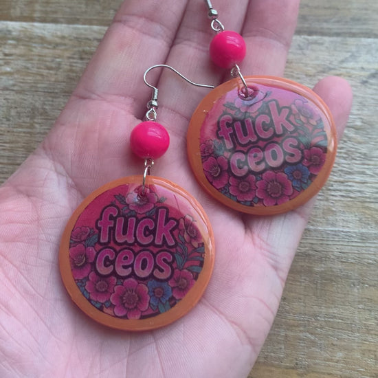 Fuck CEOs Eat the Rich Earrings Neon Pink Orange Tunnel Gauge Earrings Clip On Earrings