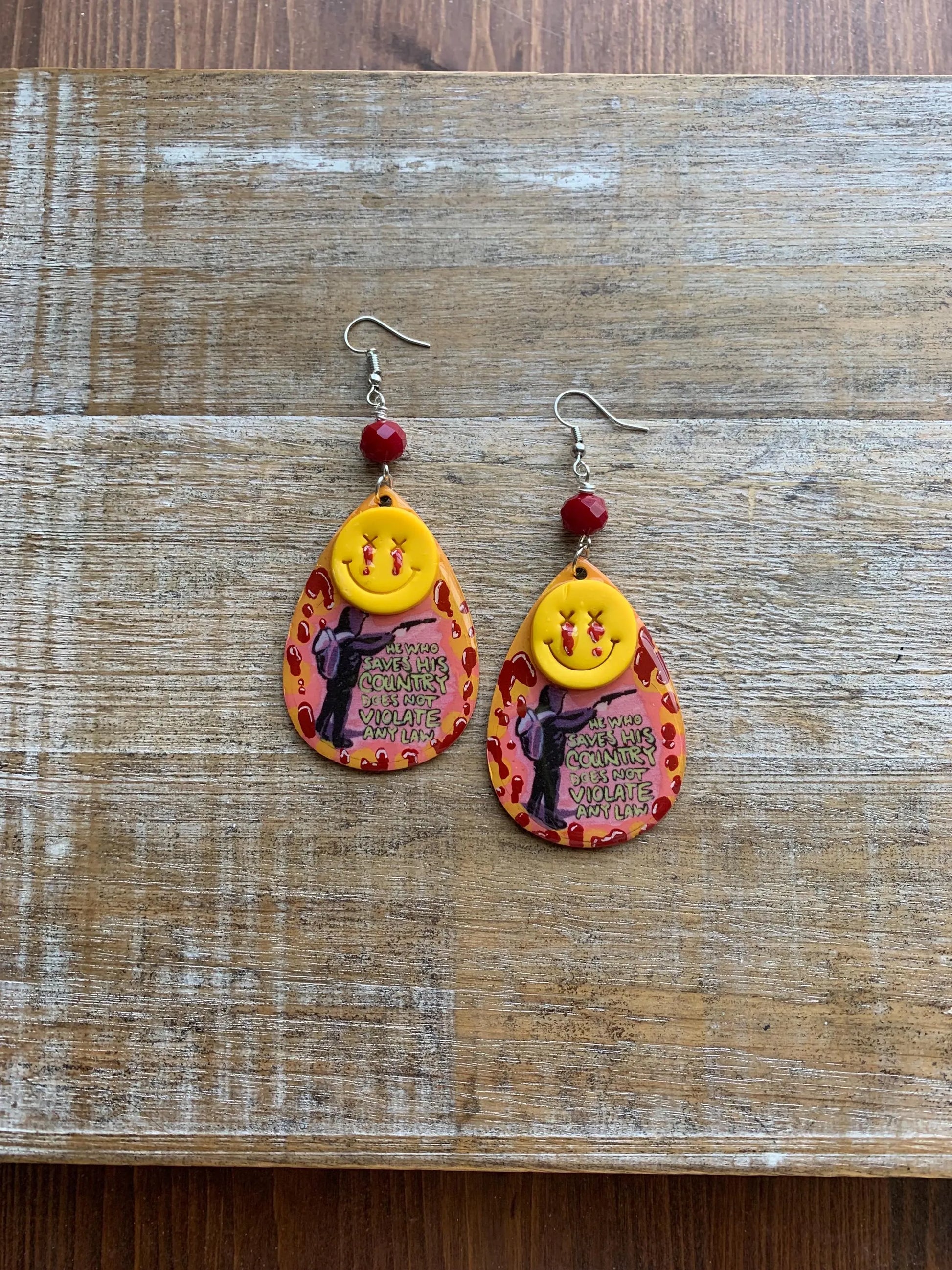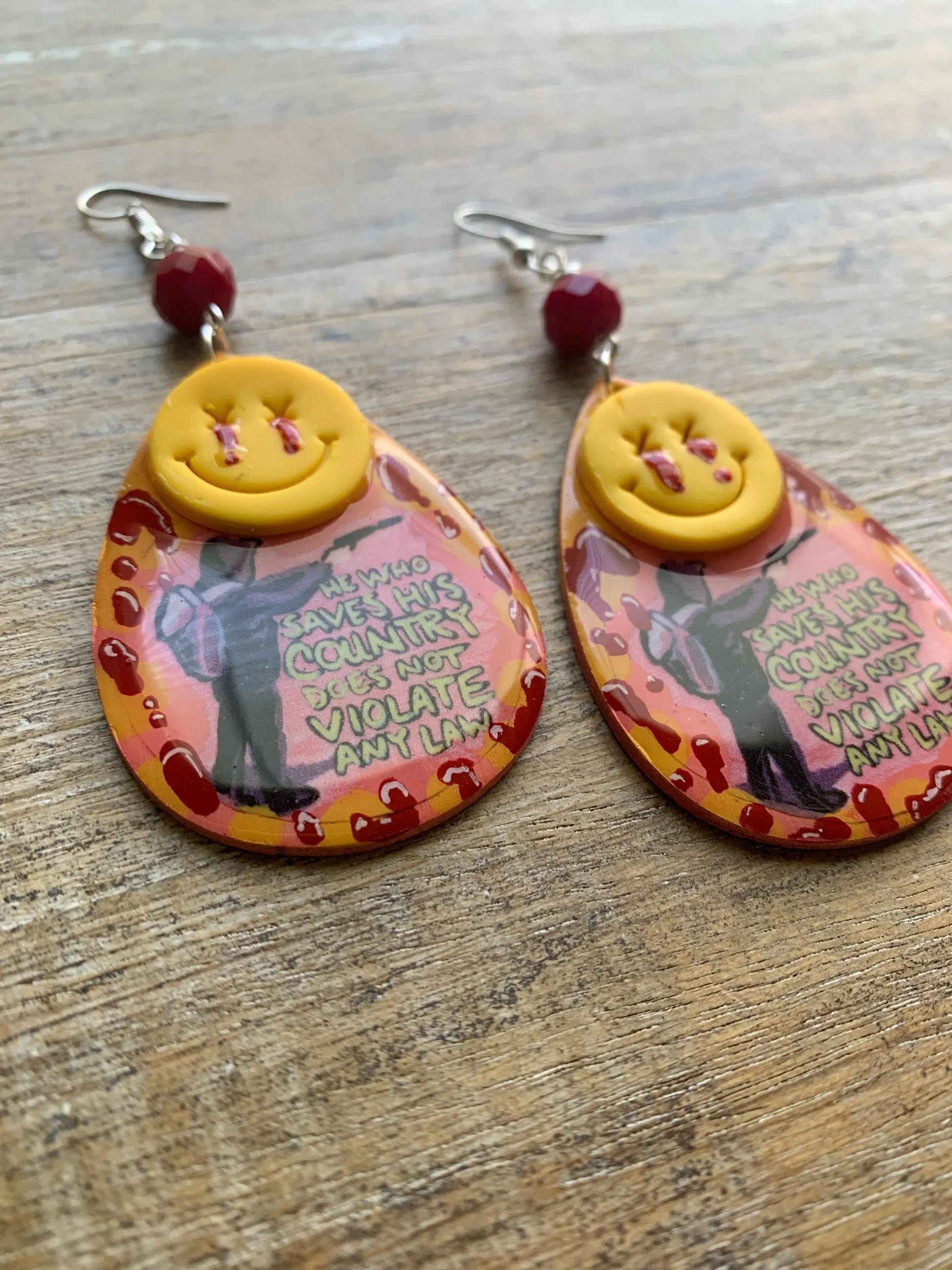He who saves his country does not violate any law earrings! These are made with wood, paper, paint, resin, glass beads and polymer clay. some small bubbles may exist in resin. Luigi quote art was created by Sentient Dirt Press.
