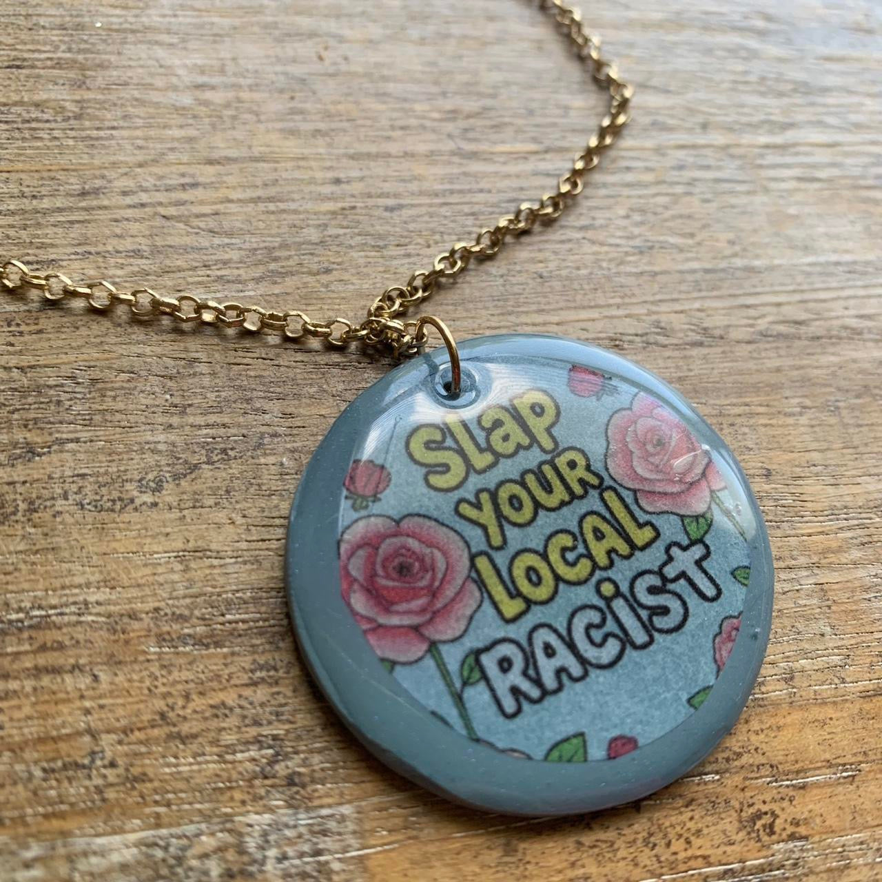 Handmade “slap your local racist” necklace.