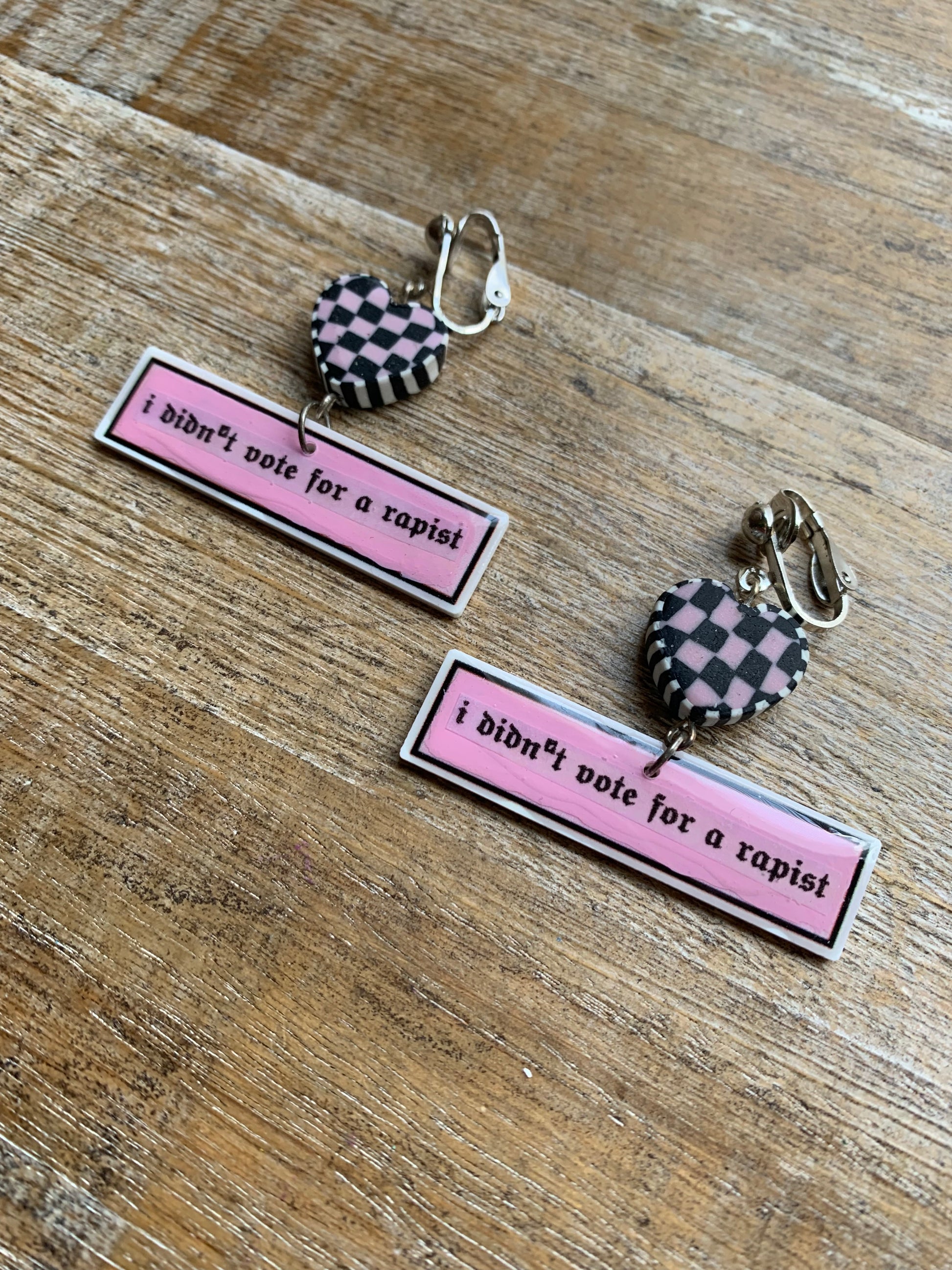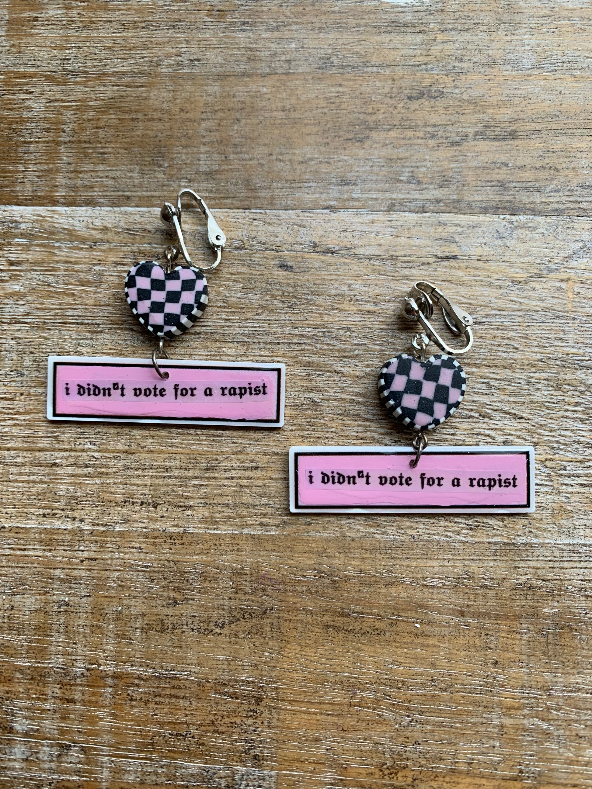 I Didn’t Vote for a Rapist Retro Clip On Earrings Art Deco Pink Checkered Liberal Ear Hangers Anti Trump Democrat Tunnel Gauge Earrings