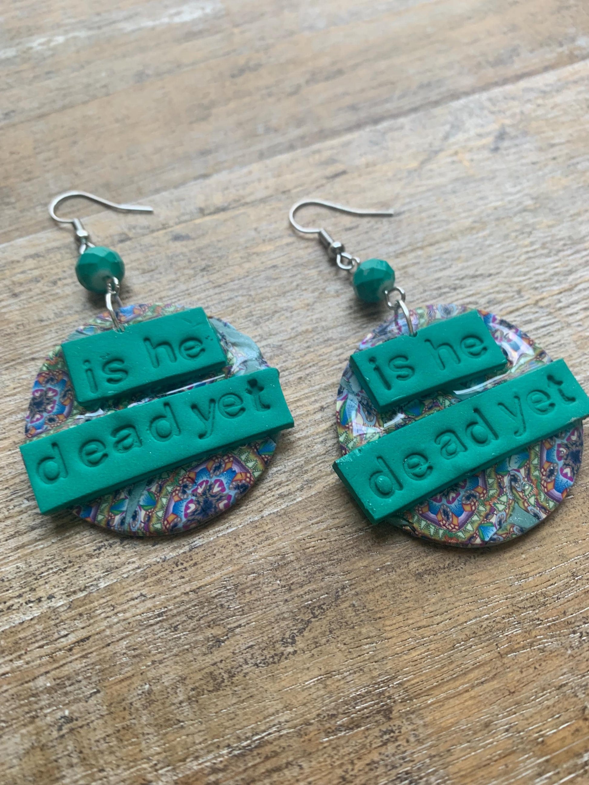 Is He Dead Yet Earrings Clay Protest Liberal Democrat Activist Funny Retro Statement Clip On Earrings Green Millennial Teal Ear Hangers