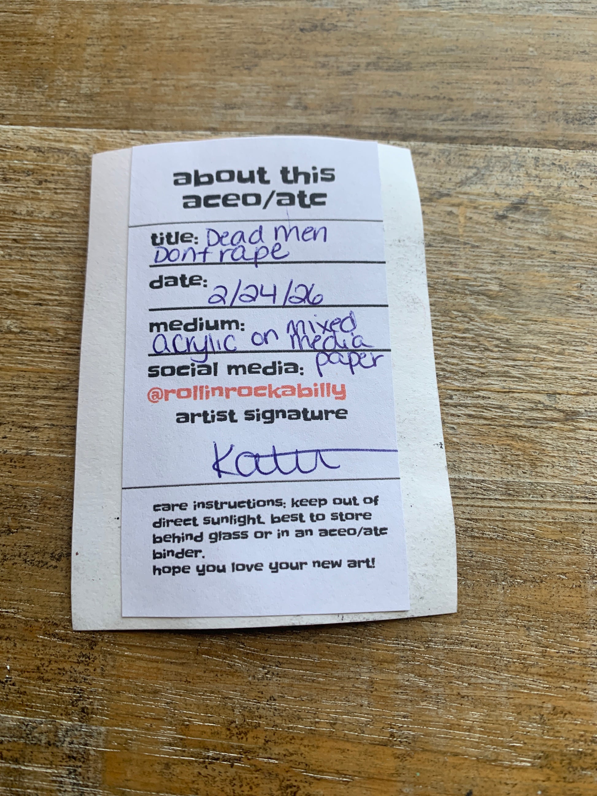 Original ACEO Acrylic Painting 2.5x3.5 Dead Men Don’t Rape Bloody Knife “Dead Men Don’t Rape”