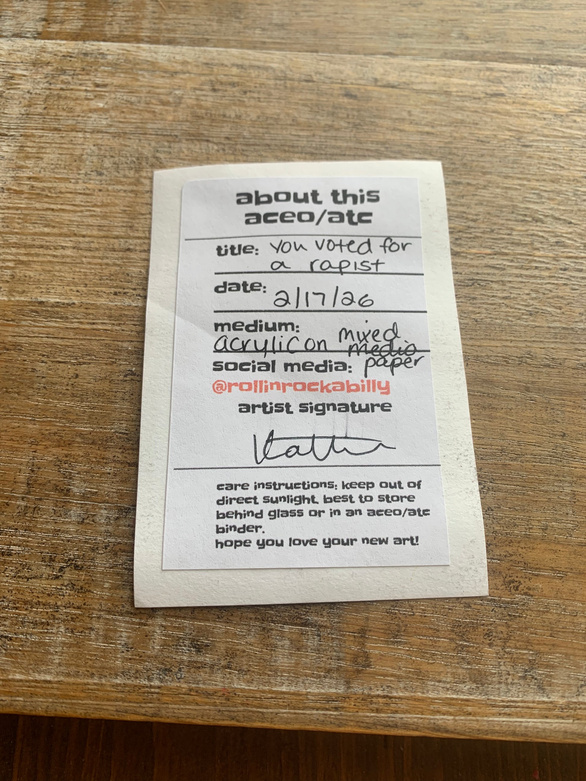 Original ACEO Acrylic Painting 2.5x3.5 Anti Trump “You Voted for a Rapist”