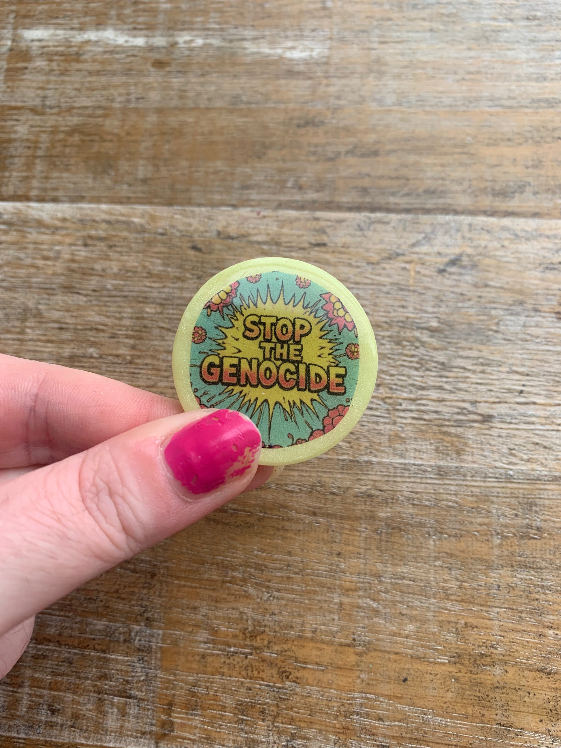 handmade stop the genocide fridge magnet. Made with polymer clay, paper, resin and a magnet.