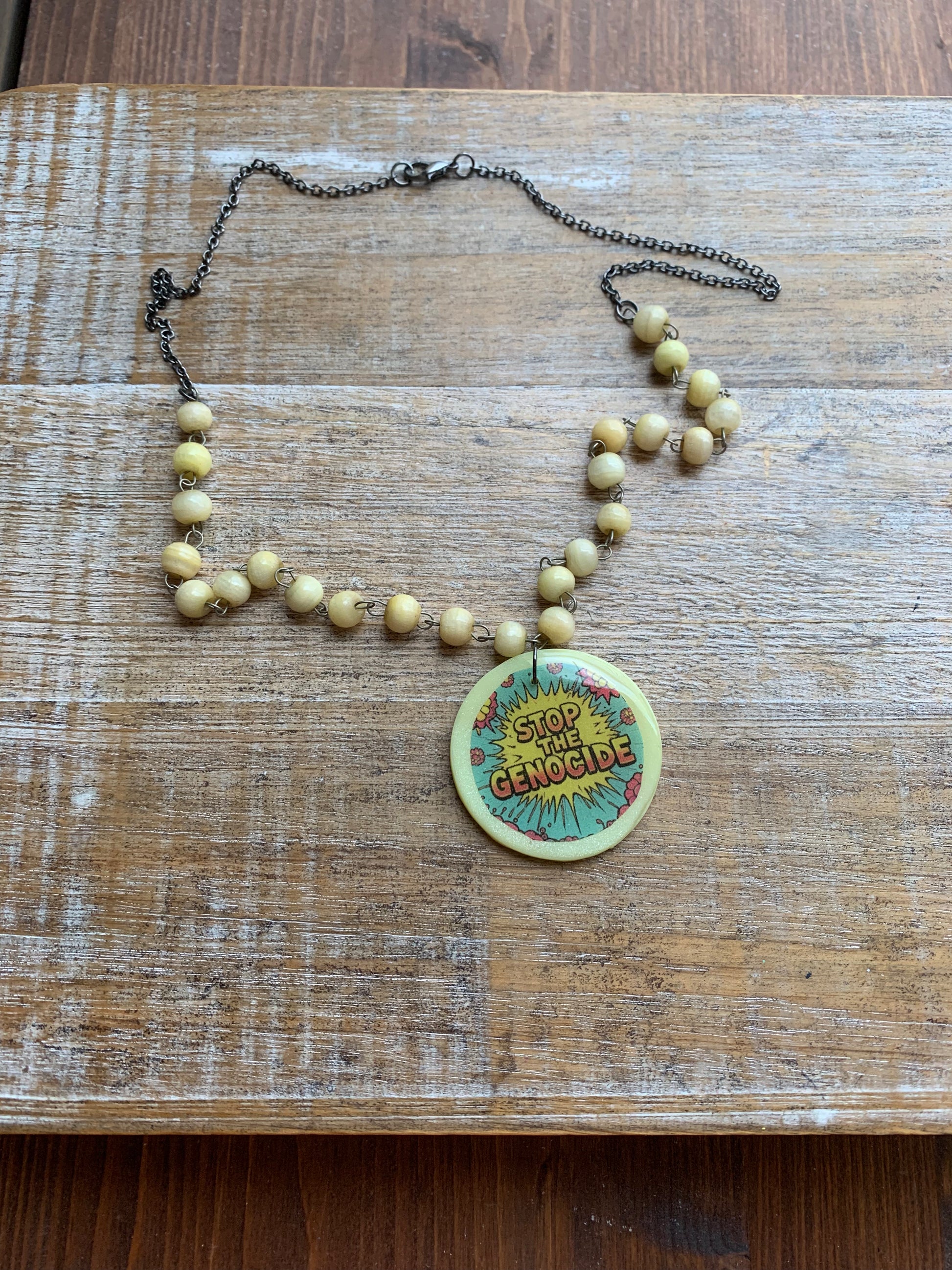 Handmade stop the genocide necklace! ONE OF A KIND! Made with polymer clay, paper, resin and a broken beaded chain.